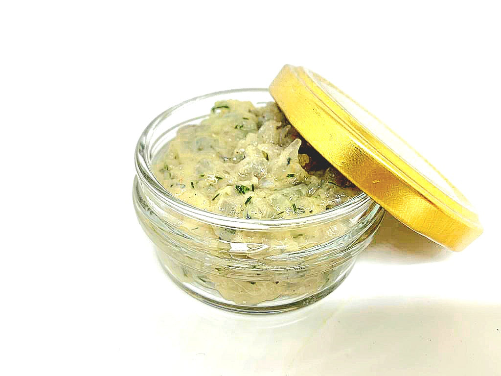 + Zutaten: Garnelen, Dill, Zwiebel, Olivenöl, Reisessig, Yuzu Saft, Salz, Pfeffer