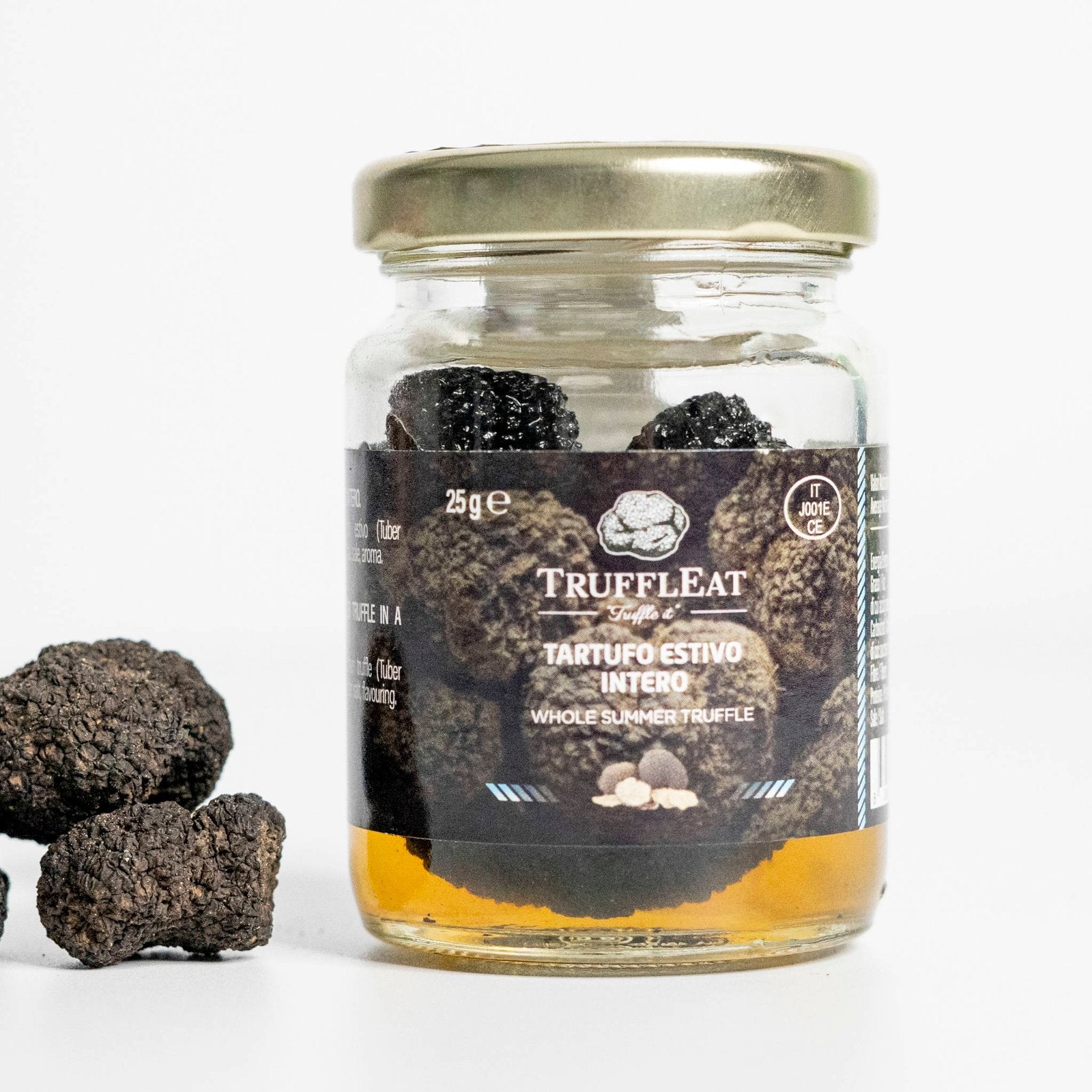 Ganze Sommertrüffel in einem Glas. Ideal zum Verfeinern von Gerichten und Vorspeisen. Die Einmachflüssigkeit im Glas kann auch als Gewürz verwendet werden.