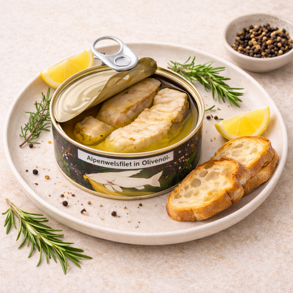 Alpenwelsfilet aus Hall in Tirol – in Olivenöl eingelegt